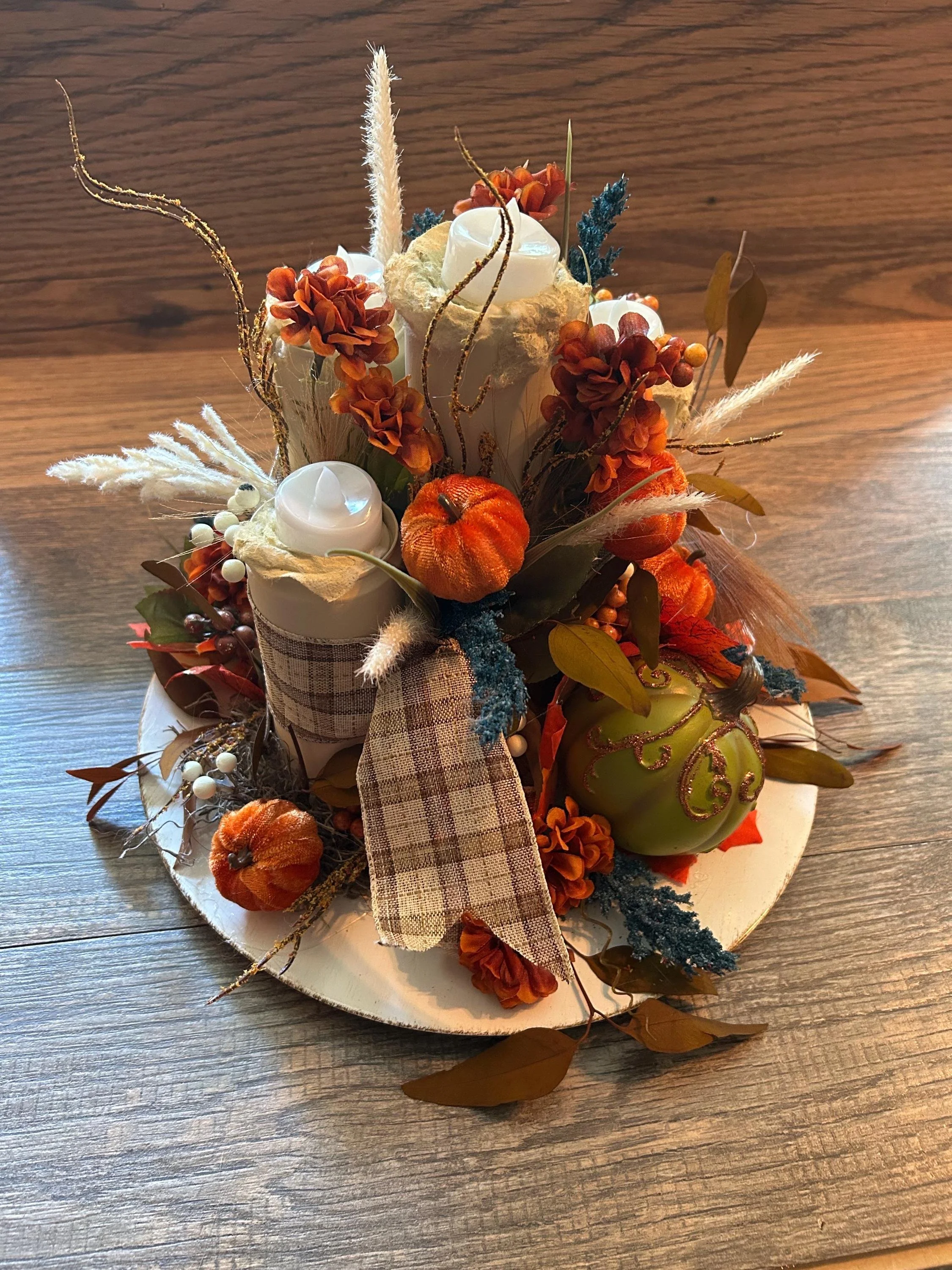 Autumn Centerpiece: Recycled Aluminum, Pumpkins, Dried Florals
