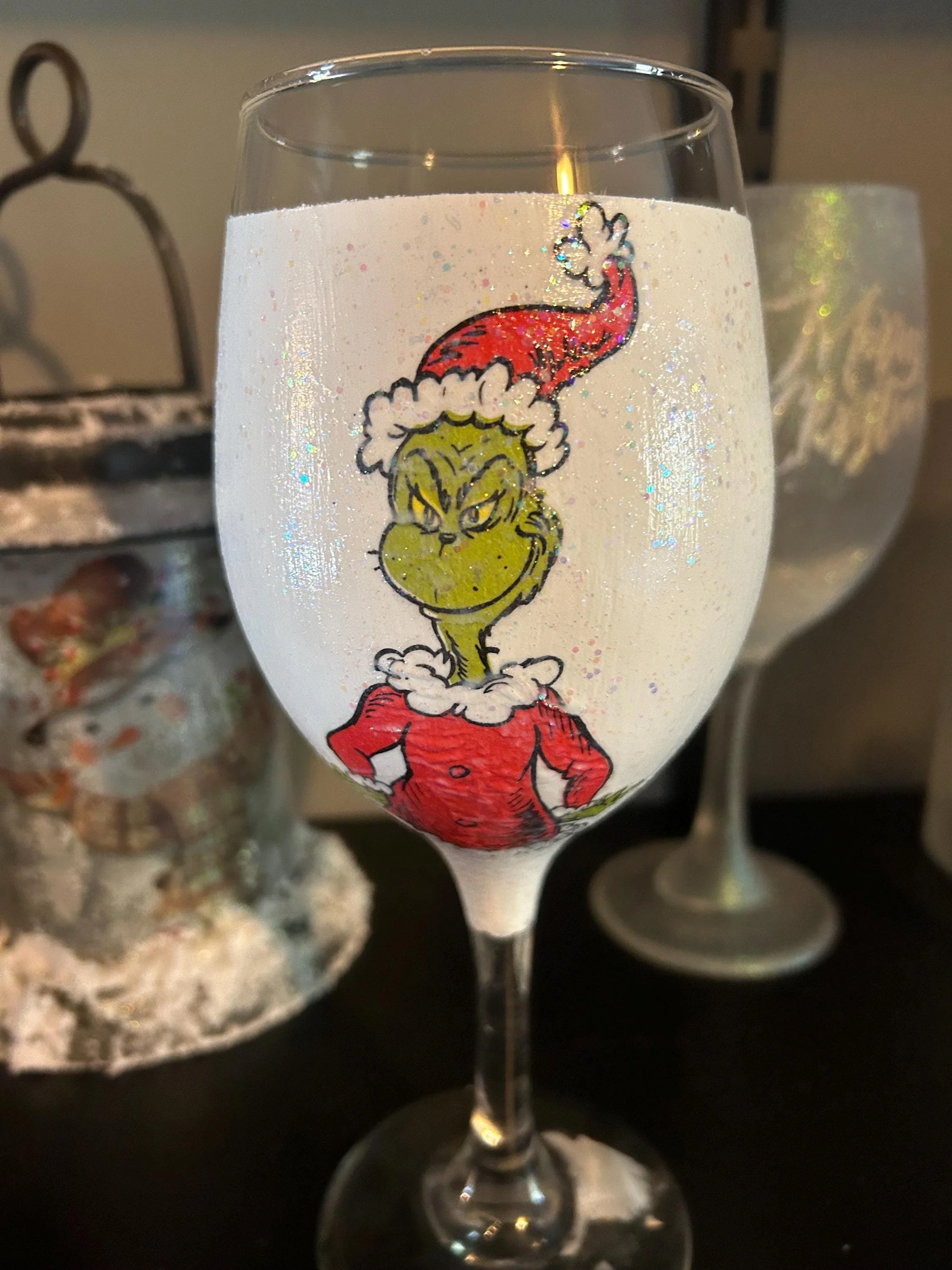 • Clear wine glass, hand-painted with premium glitter and acrylics