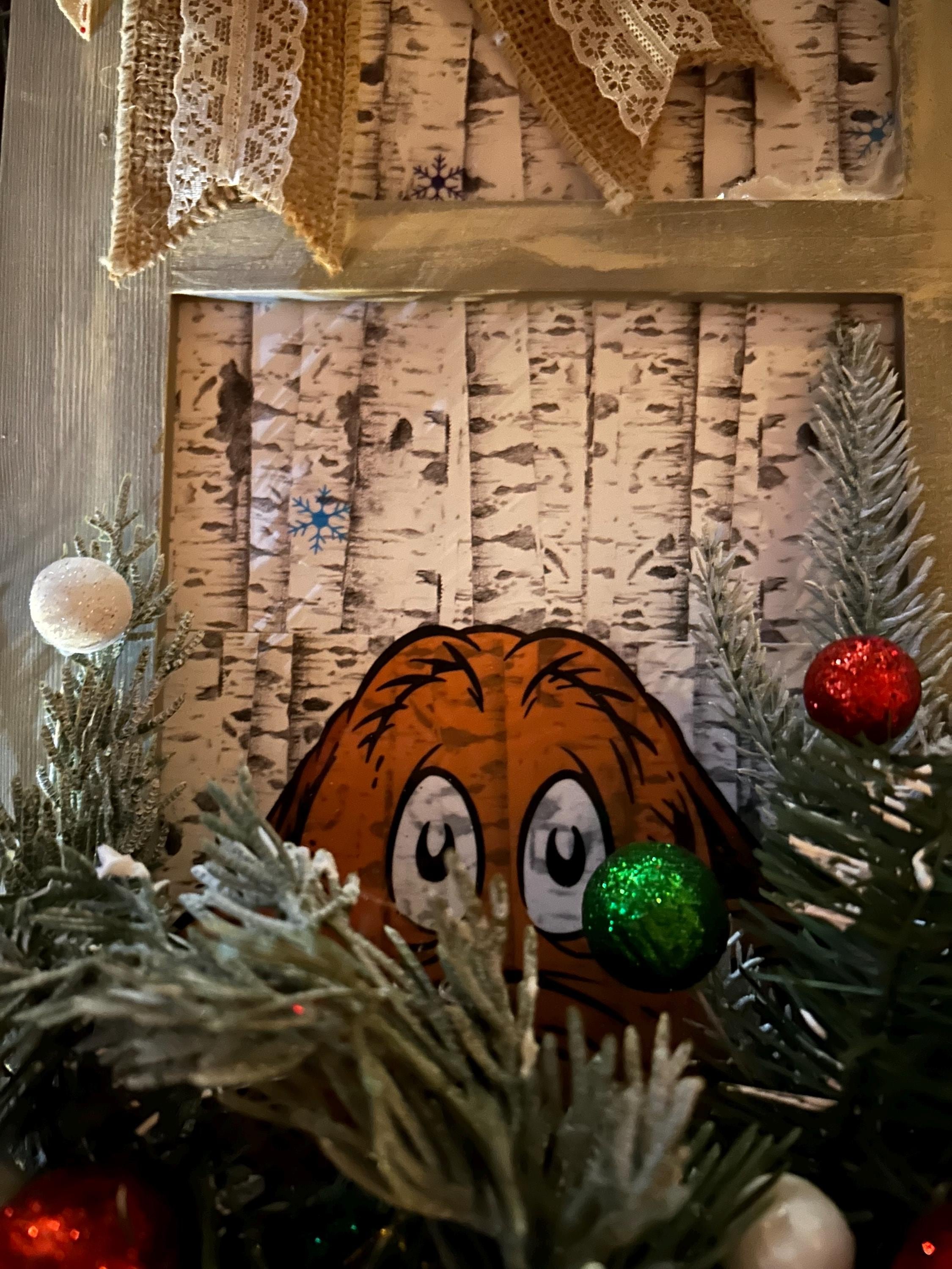 Add a touch of whimsical holiday spirit to your home with our 20x16" Grinch and Max window display featuring charming flower boxes. Crafted with attention to detail, this unique decoration captures the mischievous charm of the Grinch and his loyal dog Max, bringing warmth and festive cheer to any room or porch. Made in Maryland by skilled artisans, the vibrant colors and durable materials ensure long-lasting enjoyment throughout the holiday season. Perfect for holiday decorating or as a distinctive gift, this window display creates a joyful atmosphere that stands out from ordinary décor. Brighten your celebrations with this one-of-a-kind holiday craft from Clippermill Creations.