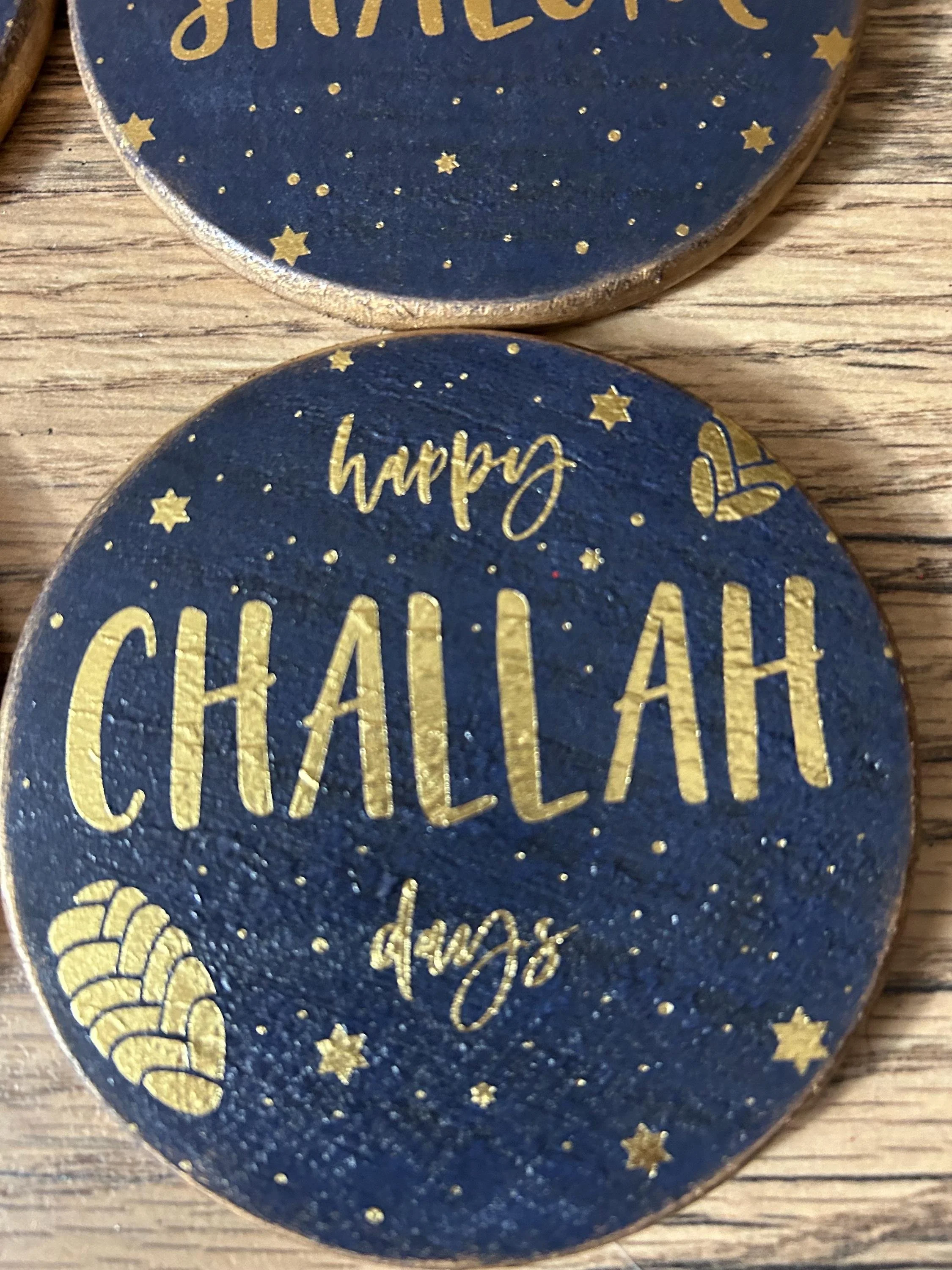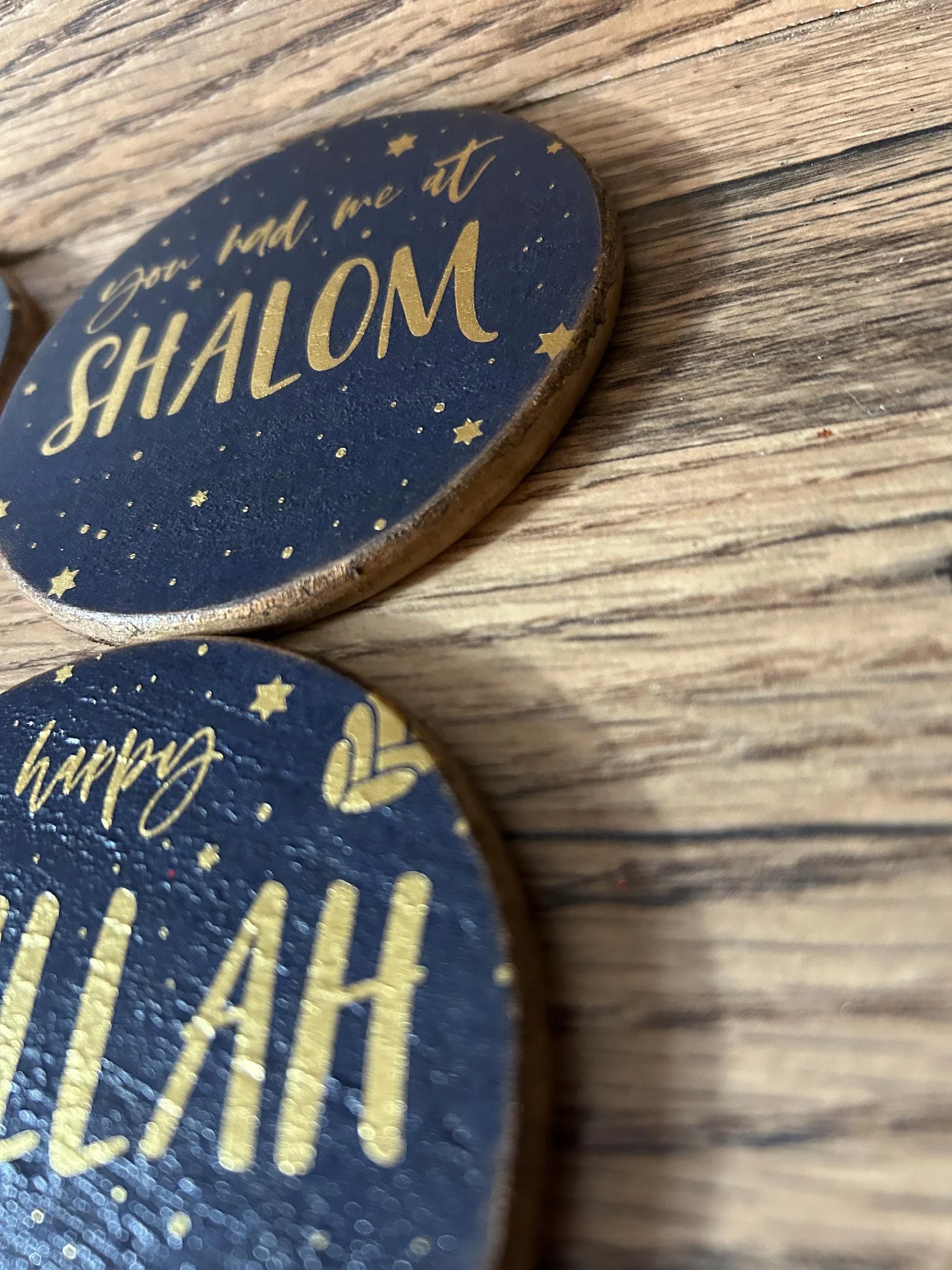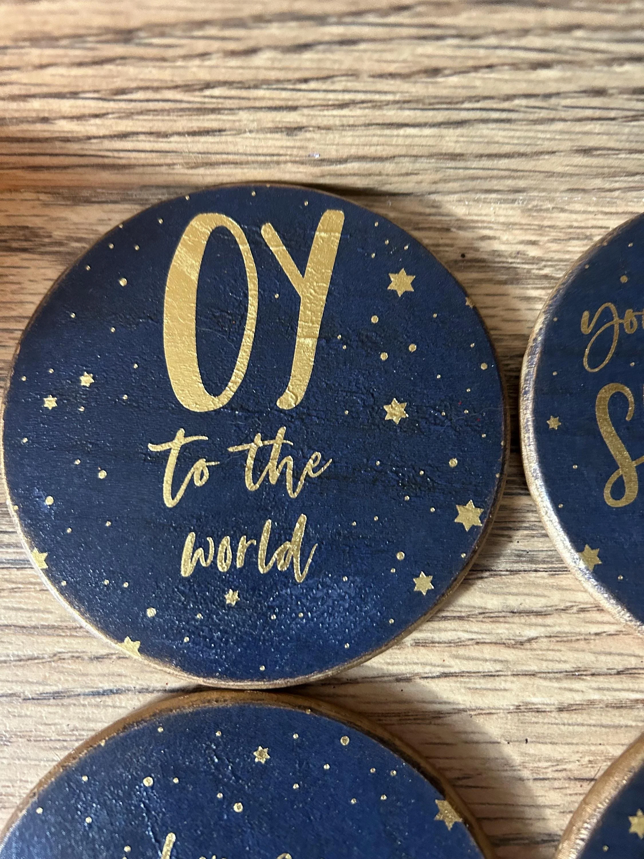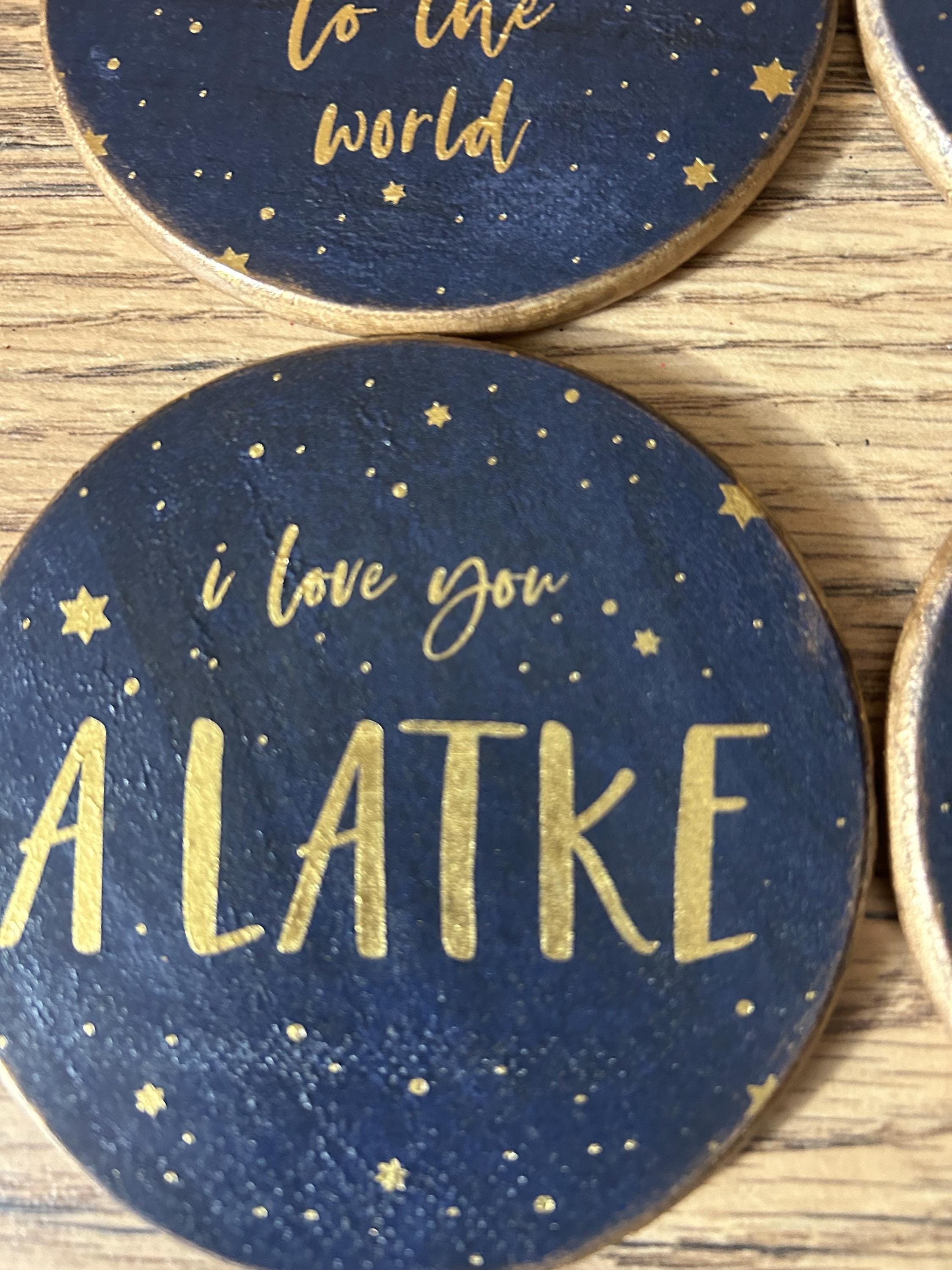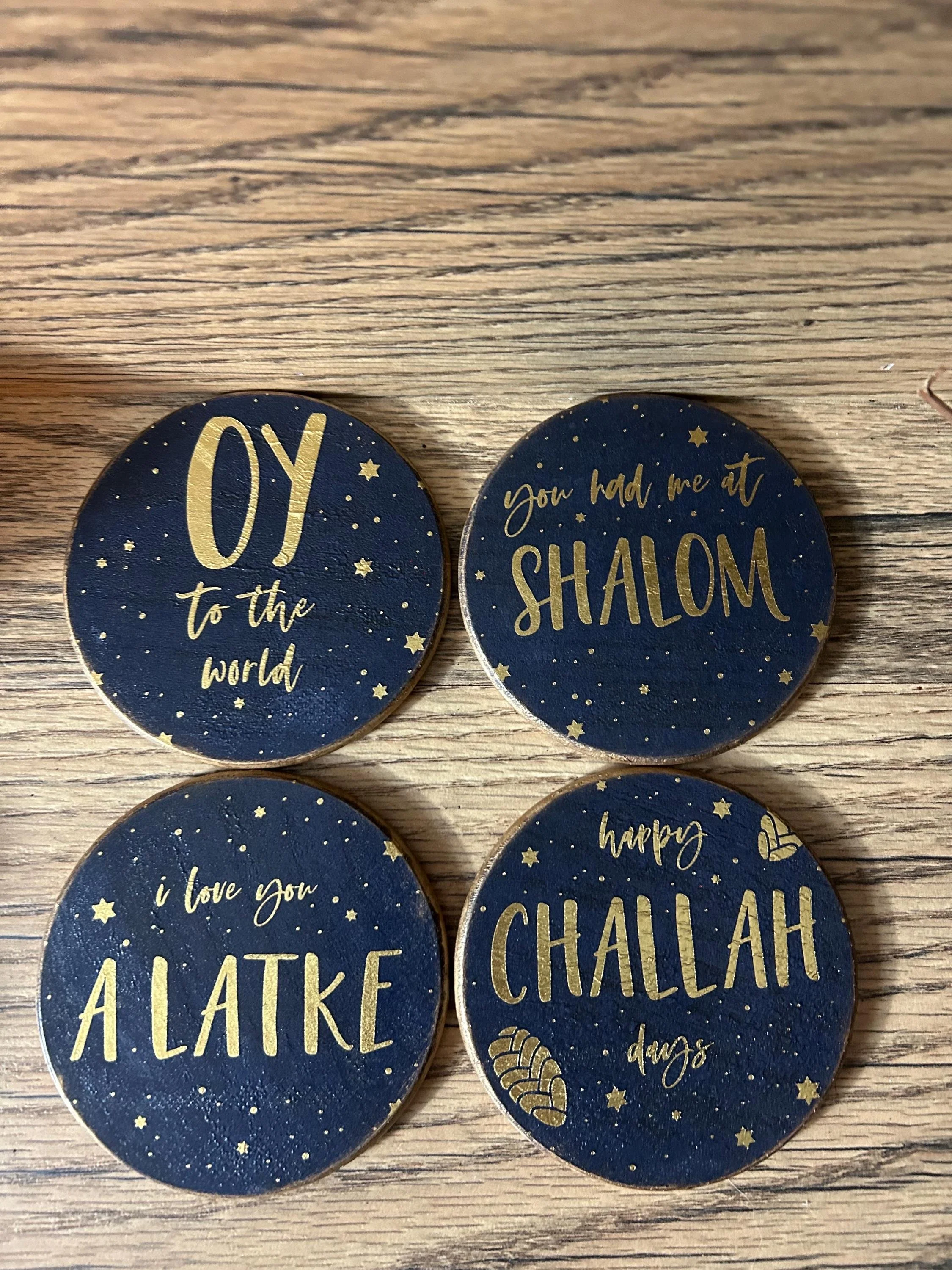 Hanukkah Coasters: Solid Pine Wood with Gold Lettering, Set of 4