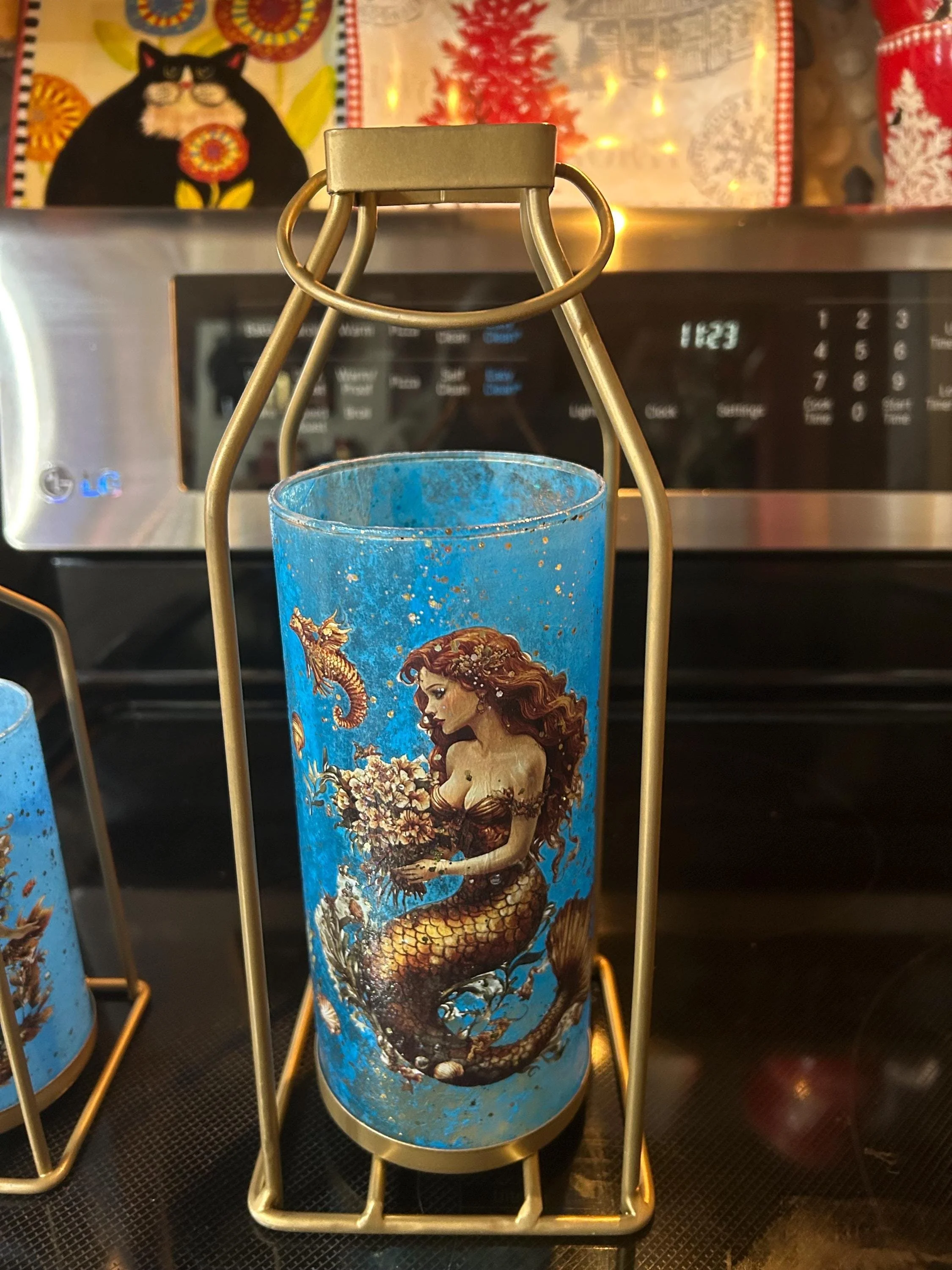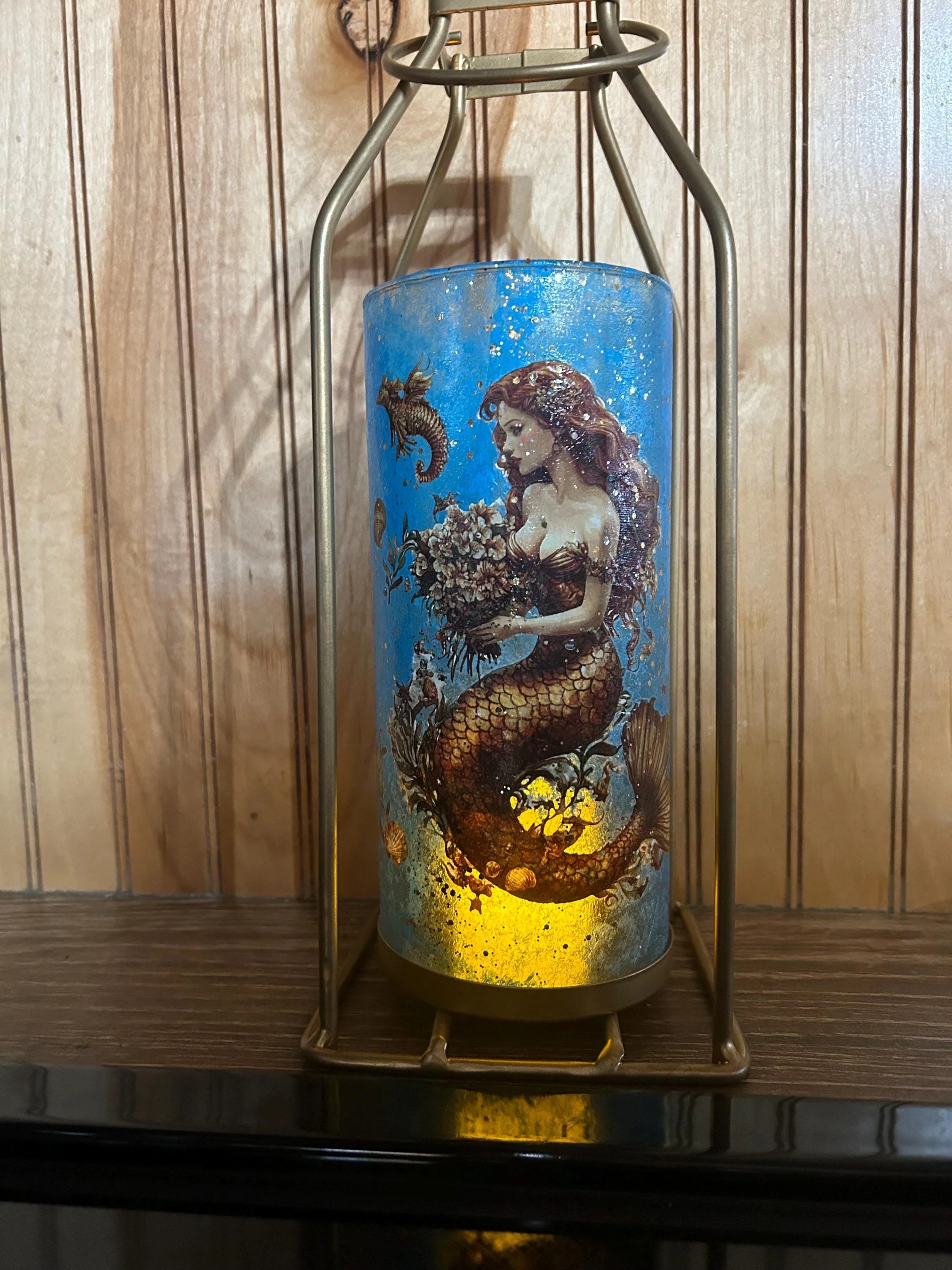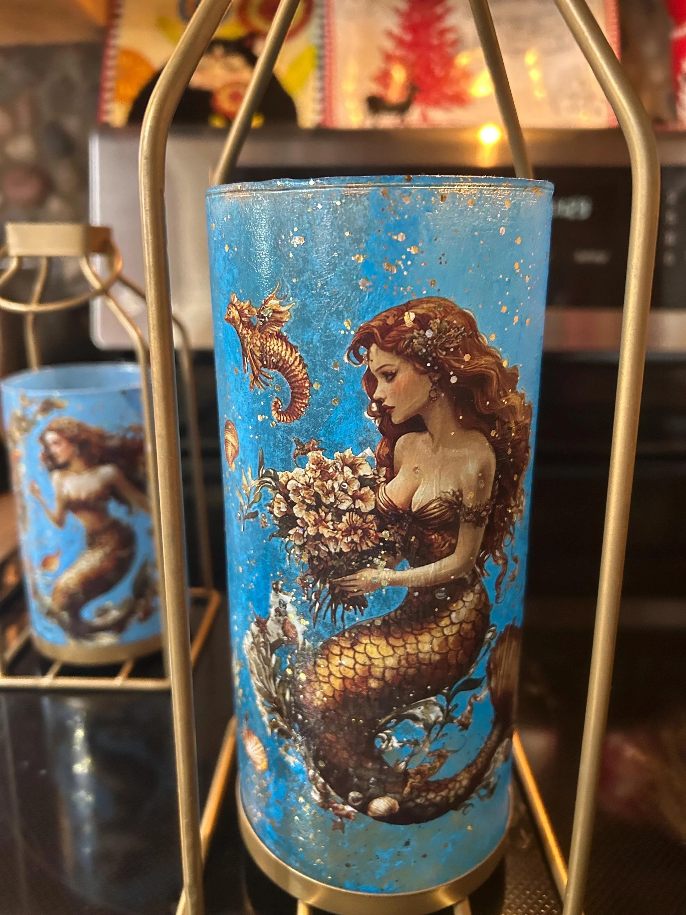 Description: Dive into enchantment with this handcrafted 12x5x5 mermaid lantern, featuring a stunning underwater illustration wrapped around a glass cylinder. The artwork showcases a graceful mermaid with flowing golden hair and a shimmering tail, cradling a bouquet of seashells and aquatic flora. Surrounded by tiny fish and ocean treasures, she glows in a dreamy marine palette of blues and iridescent accents.