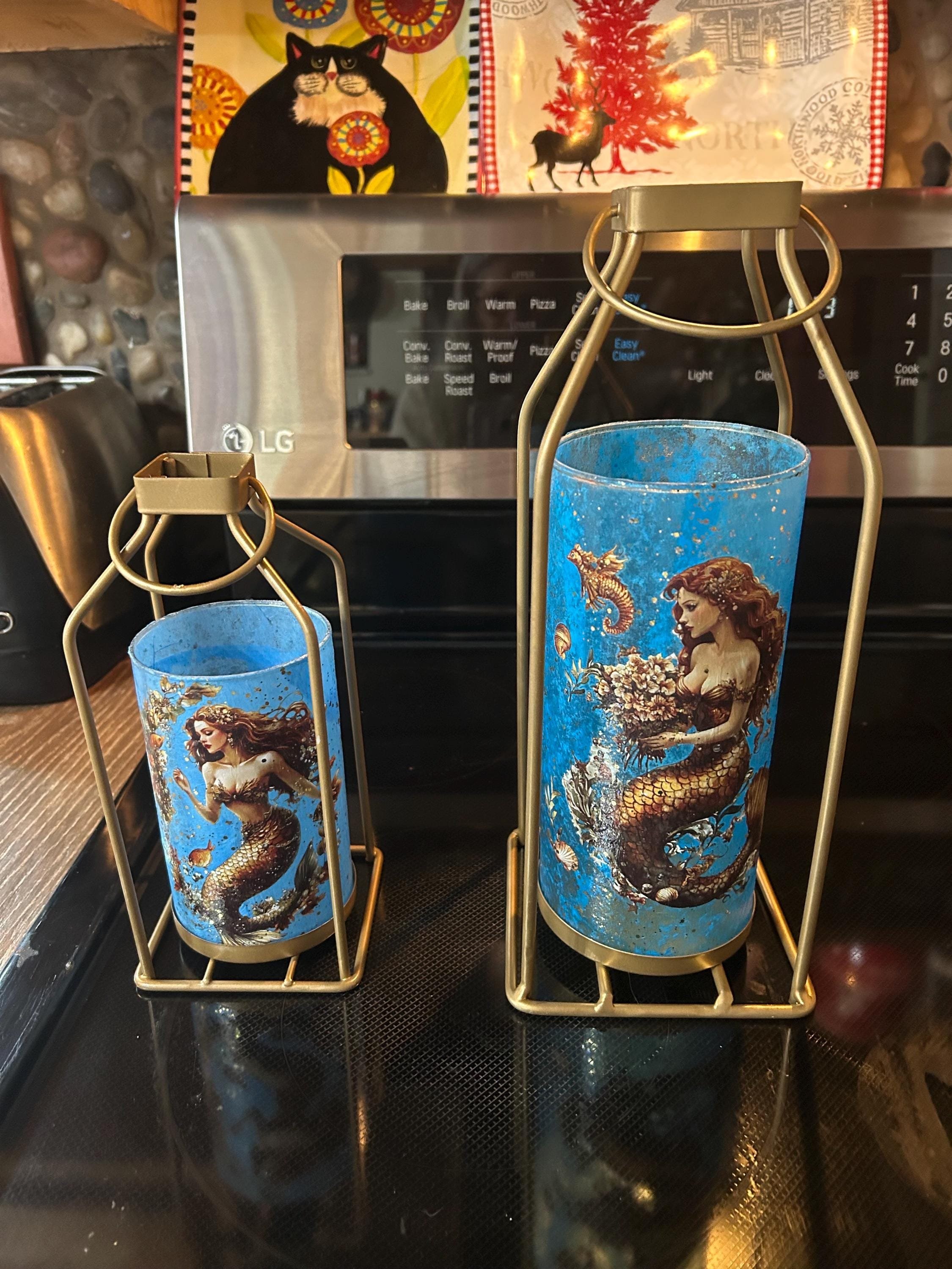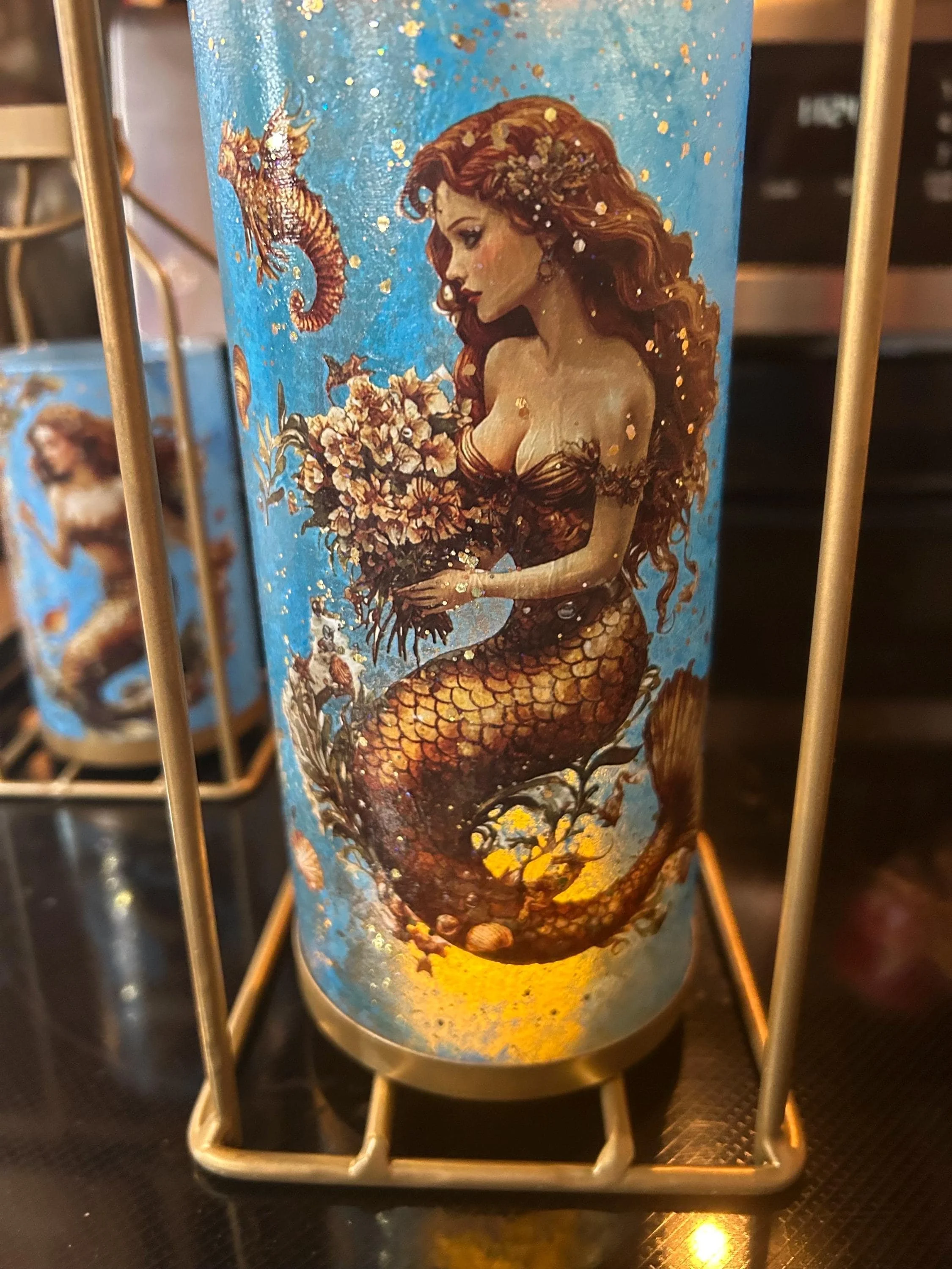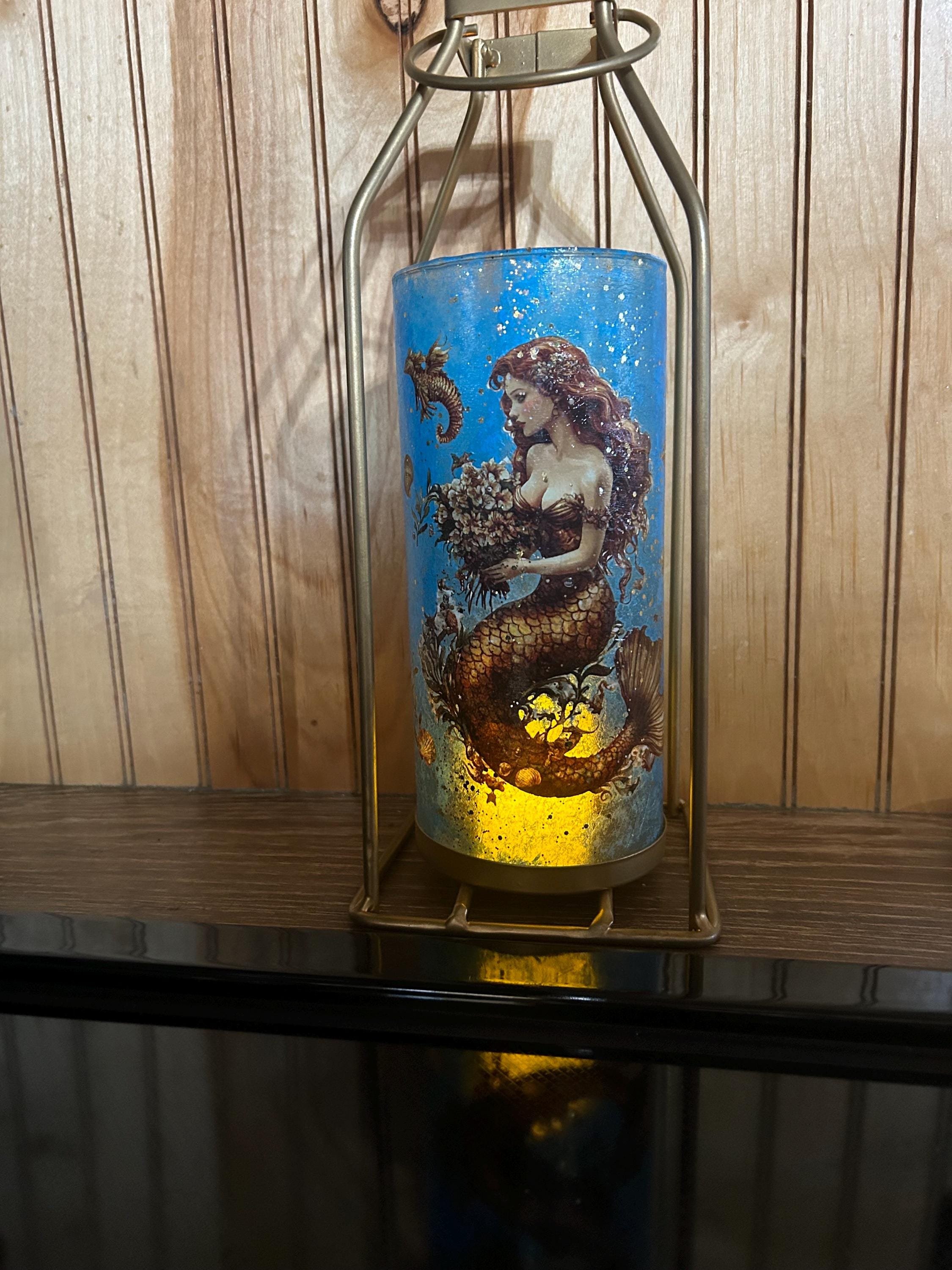Description: Dive into enchantment with this handcrafted 12x5x5 mermaid lantern, featuring a stunning underwater illustration wrapped around a glass cylinder. The artwork showcases a graceful mermaid with flowing golden hair and a shimmering tail, cradling a bouquet of seashells and aquatic flora. Surrounded by tiny fish and ocean treasures, she glows in a dreamy marine palette of blues and iridescent accents.