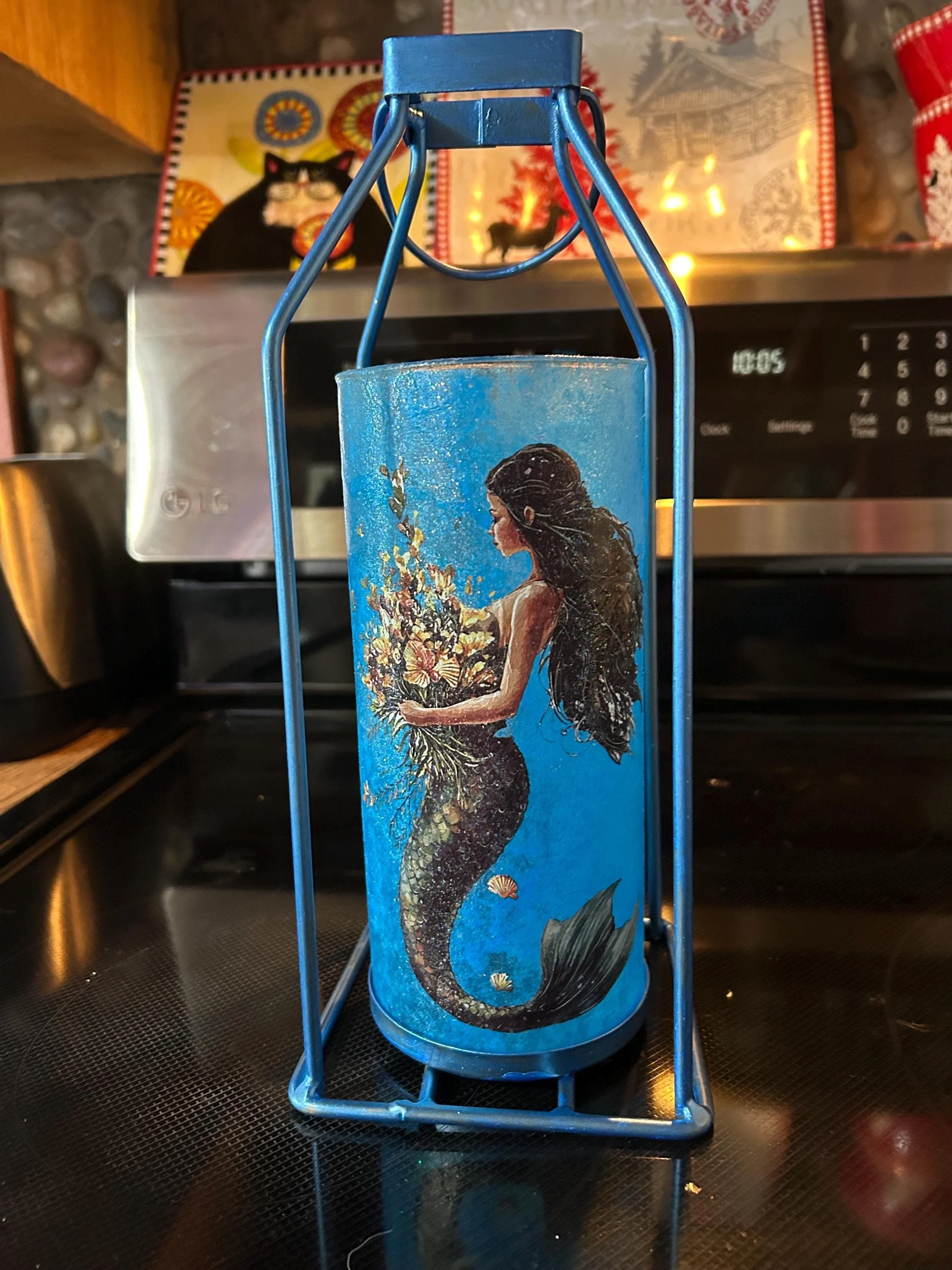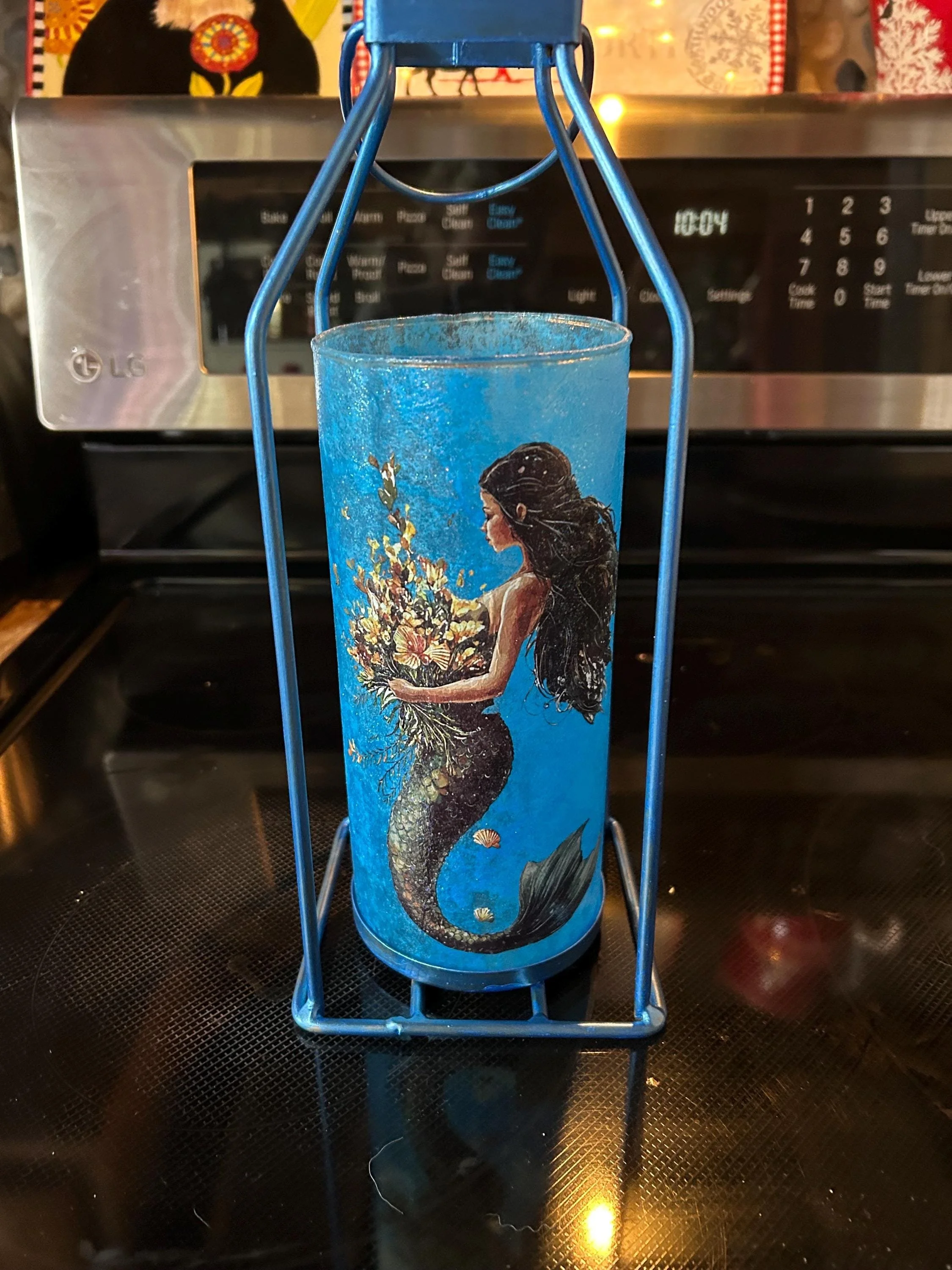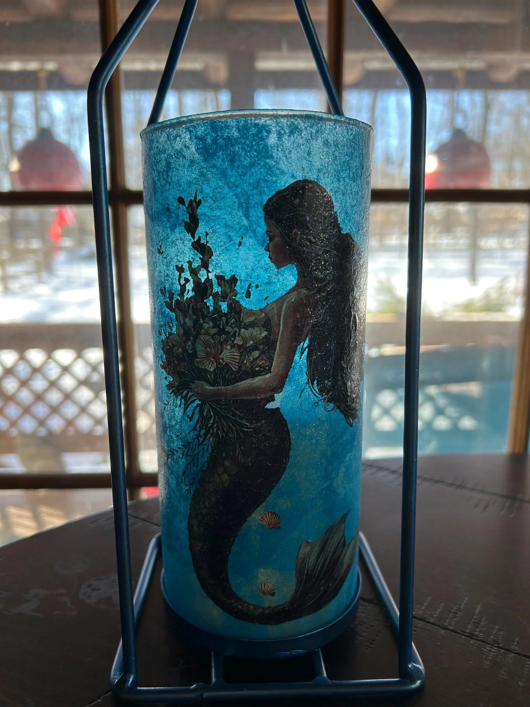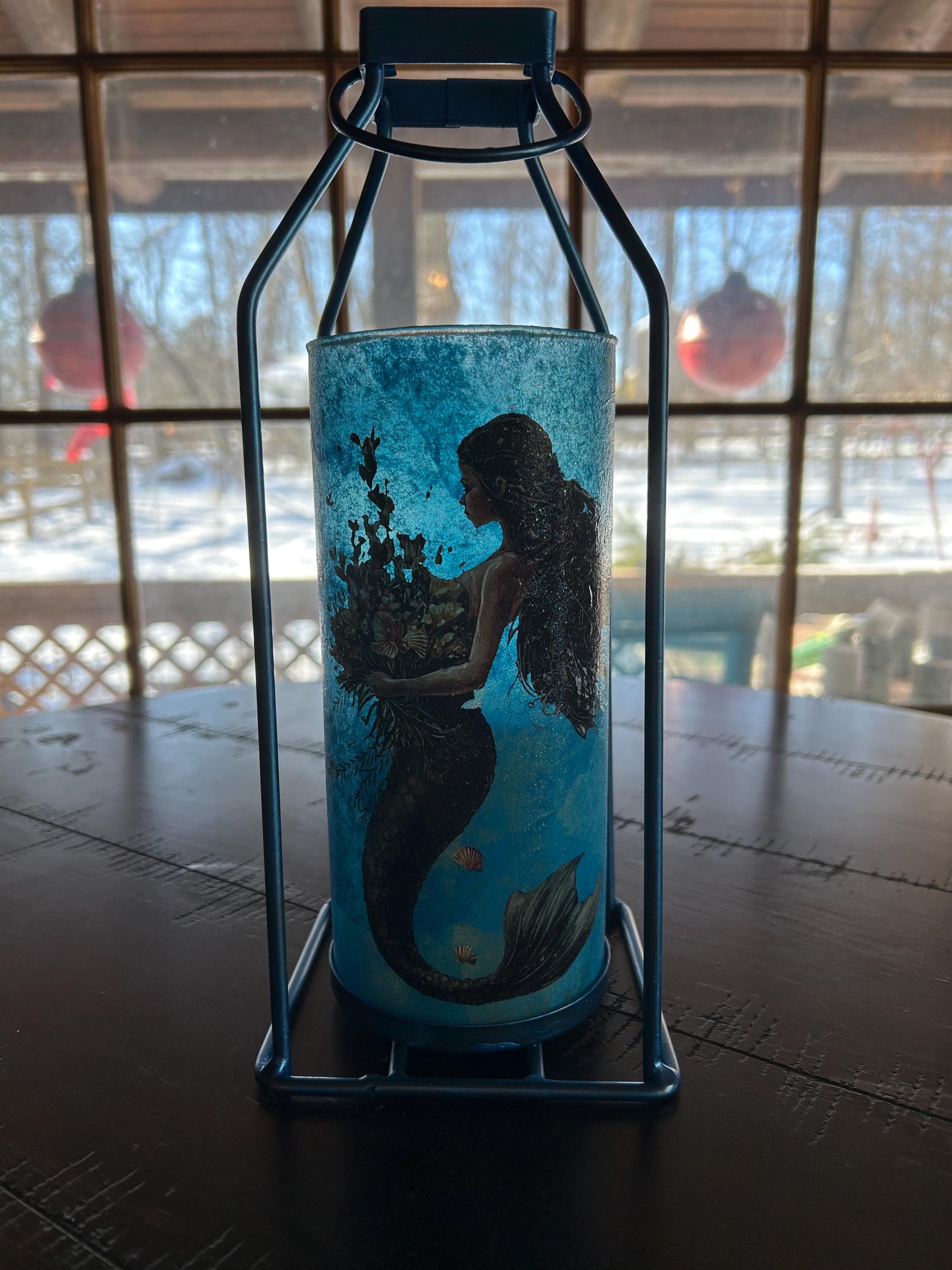 Description: Dive into enchantment with this handcrafted 12x5x5 mermaid lantern, featuring a stunning underwater illustration wrapped around a glass cylinder. The artwork showcases a graceful mermaid with flowing dark hair and a shimmering tail, cradling a bouquet of seashells and aquatic flora. Surrounded by tiny fish and ocean treasures, she glows in a dreamy marine palette of blues and iridescent accents.