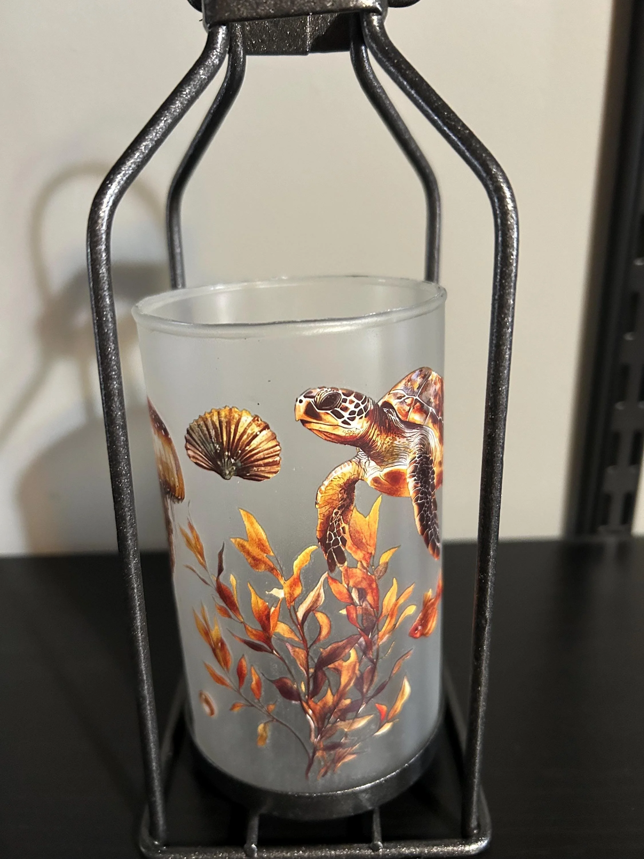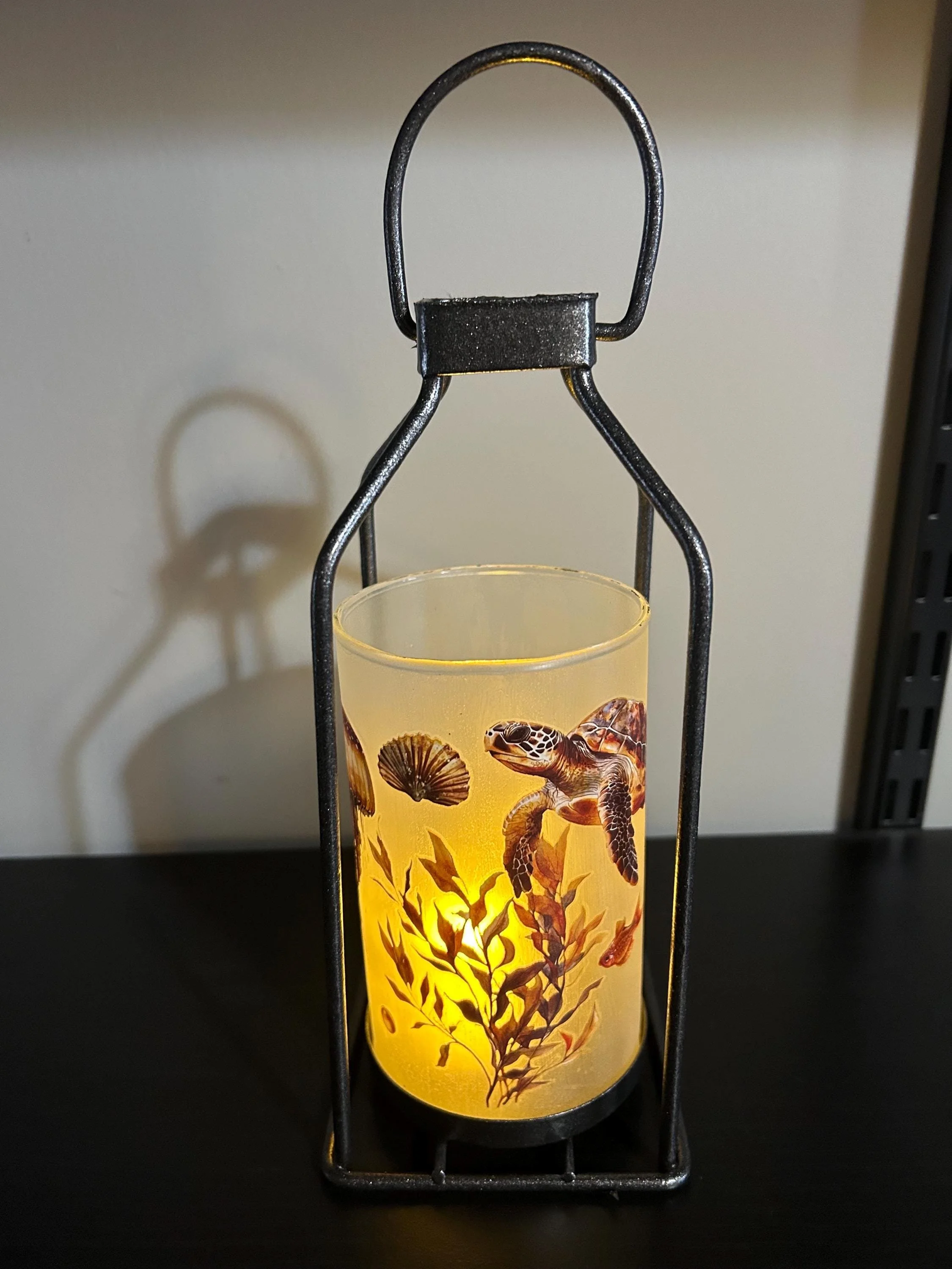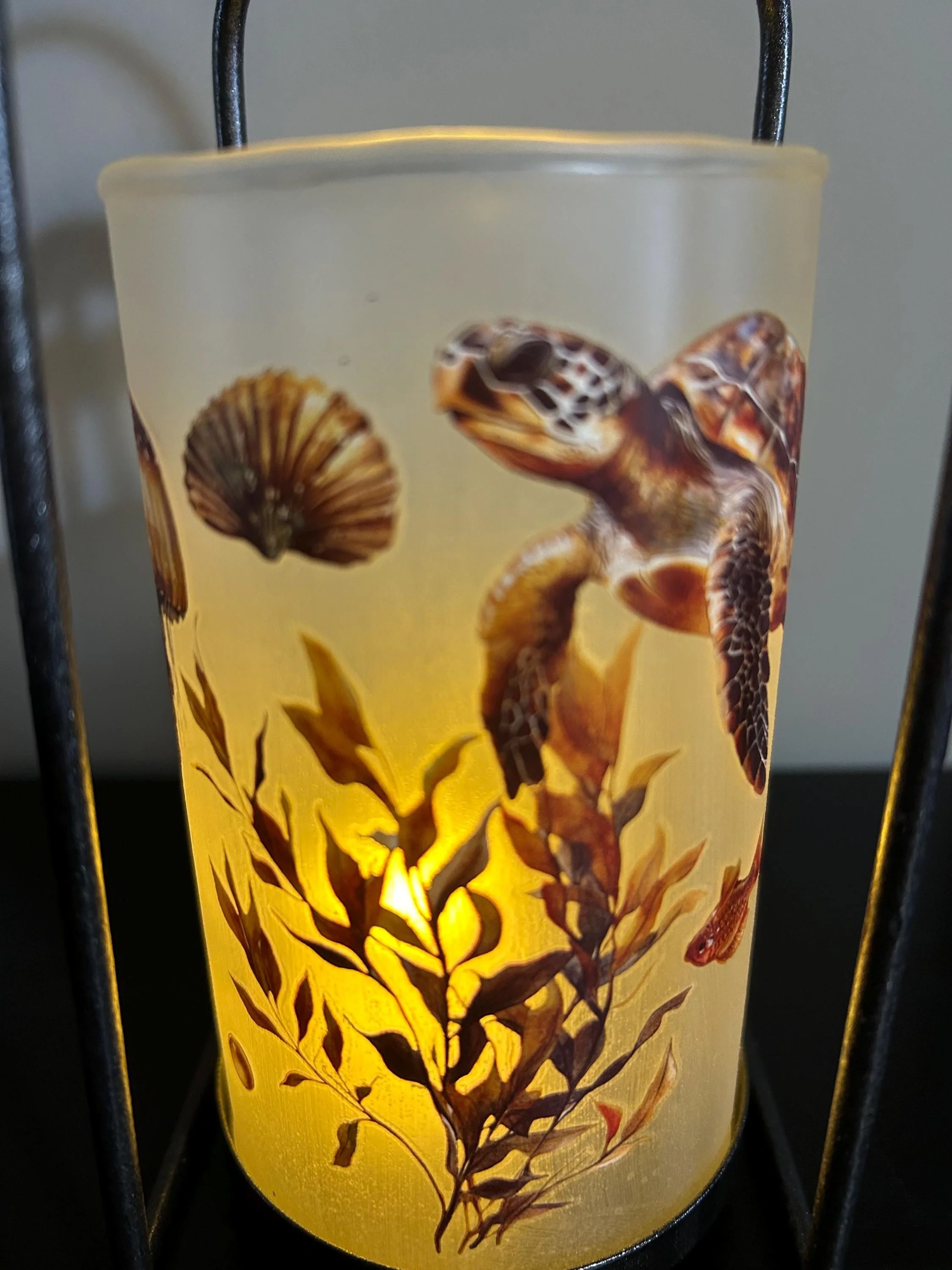 Bring the calm beauty of the ocean into your home with this hand‑decorated sea turtle lantern, featuring a detailed underwater scene that glows softly when lit. The artwork wraps around the glass—sea turtle, shells, seaweed, and gentle aquatic colors—creating a warm, coastal ambiance perfect for any room.