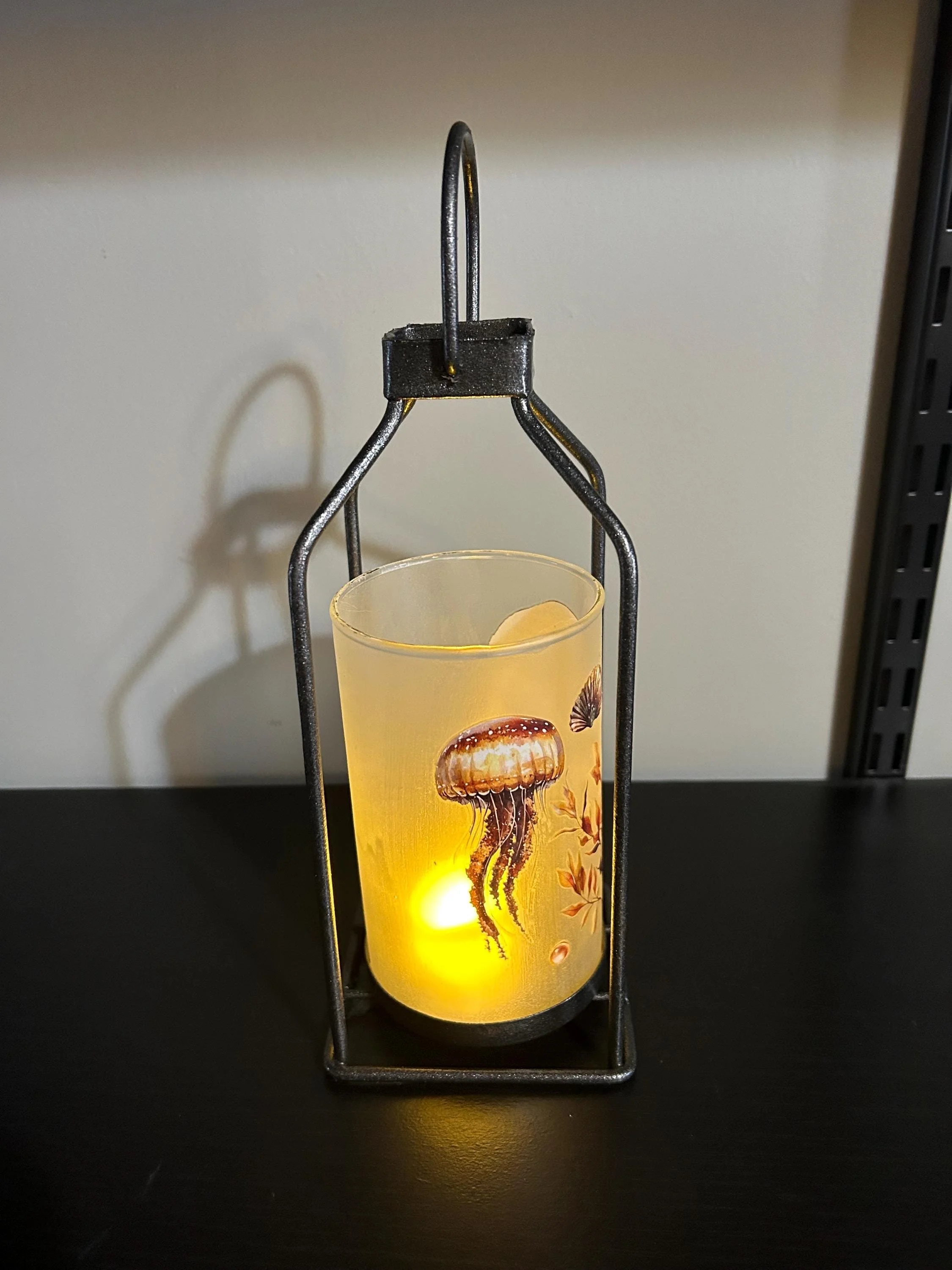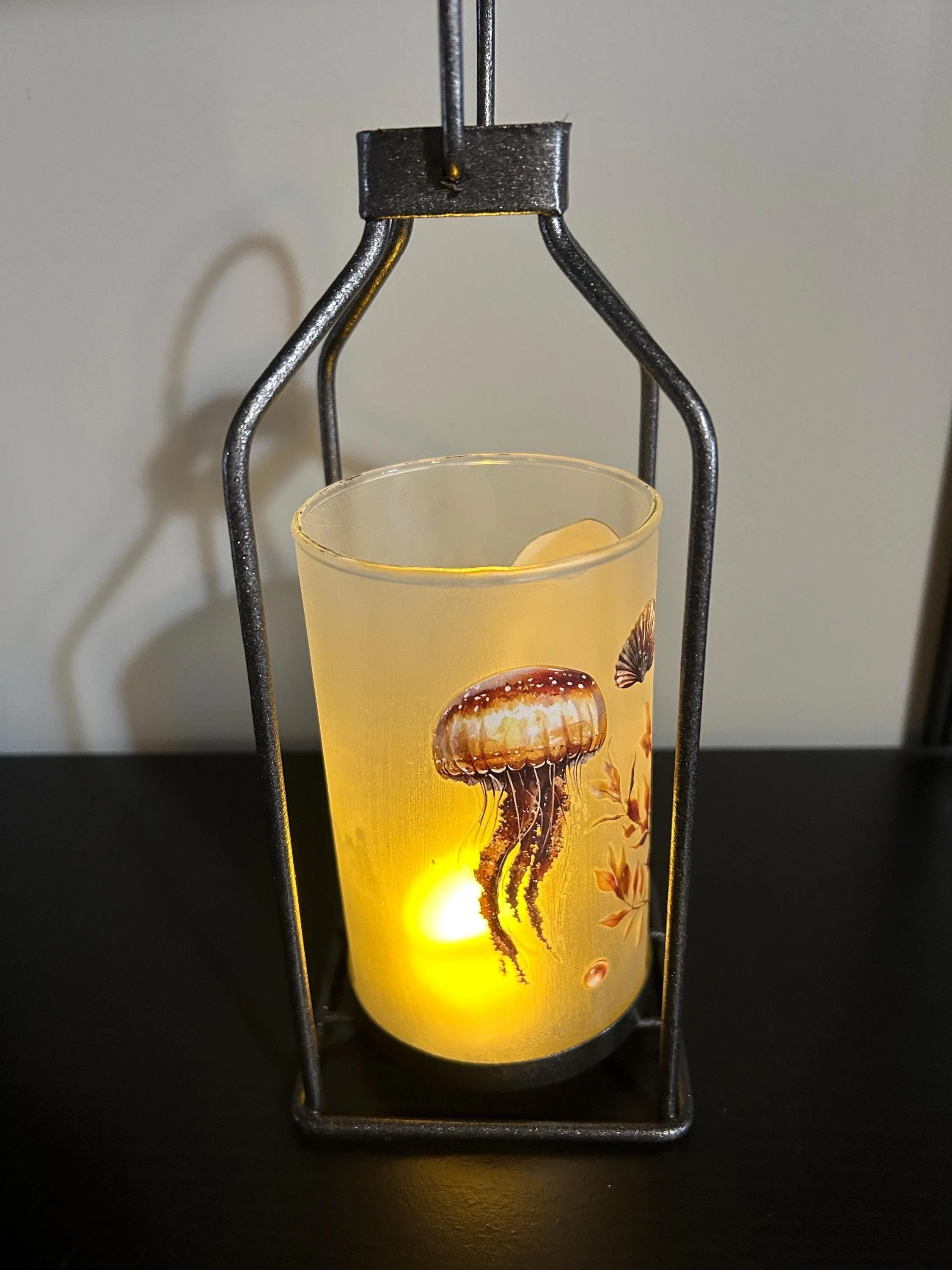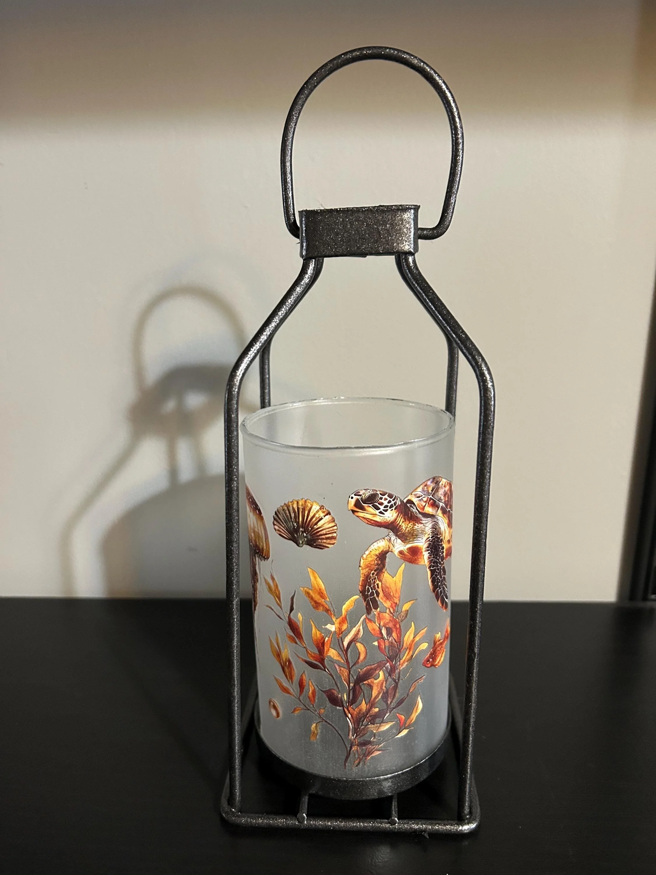 Bring the calm beauty of the ocean into your home with this hand‑decorated sea turtle lantern, featuring a detailed underwater scene that glows softly when lit. The artwork wraps around the glass—sea turtle, shells, seaweed, and gentle aquatic colors—creating a warm, coastal ambiance perfect for any room.