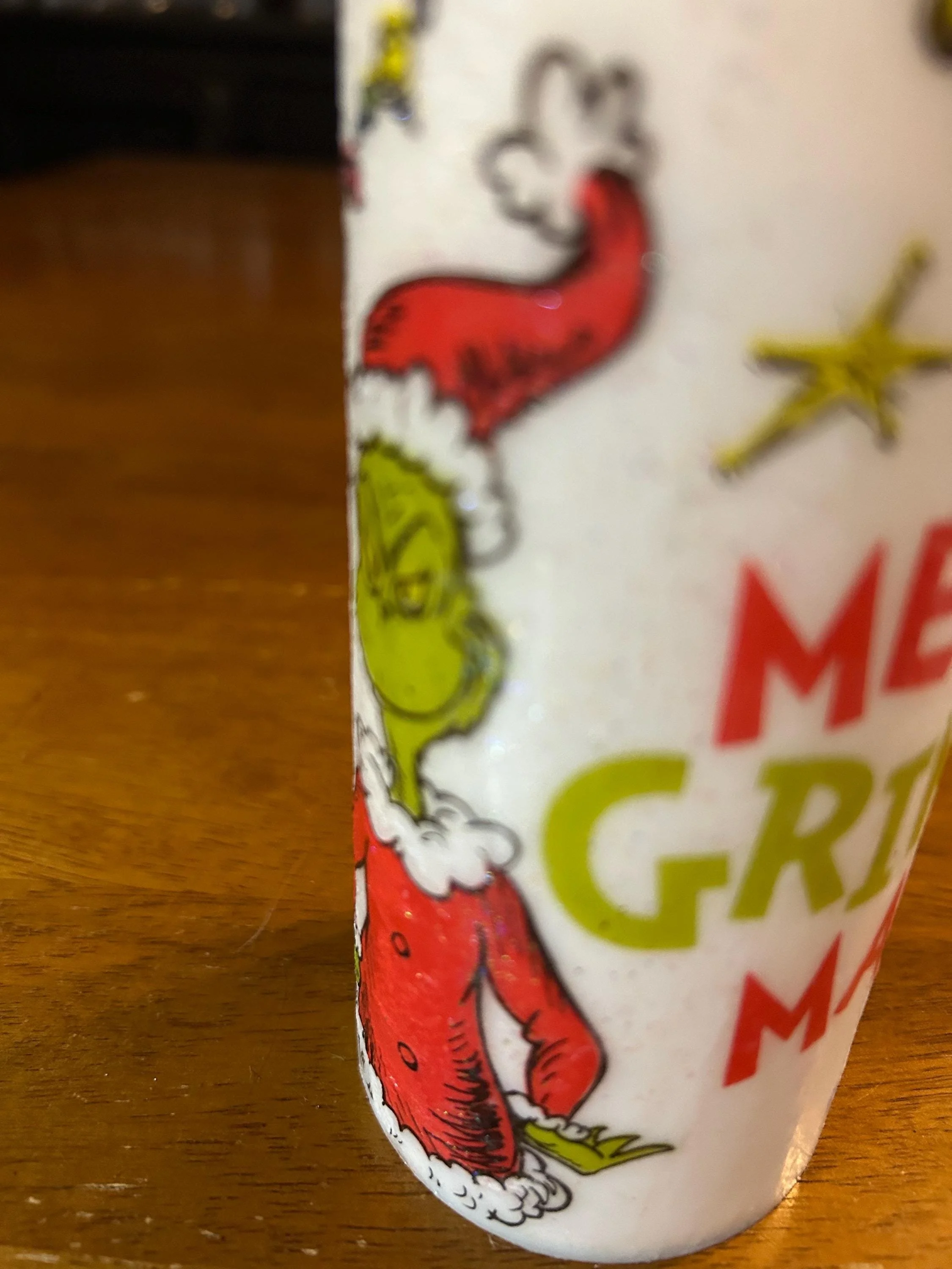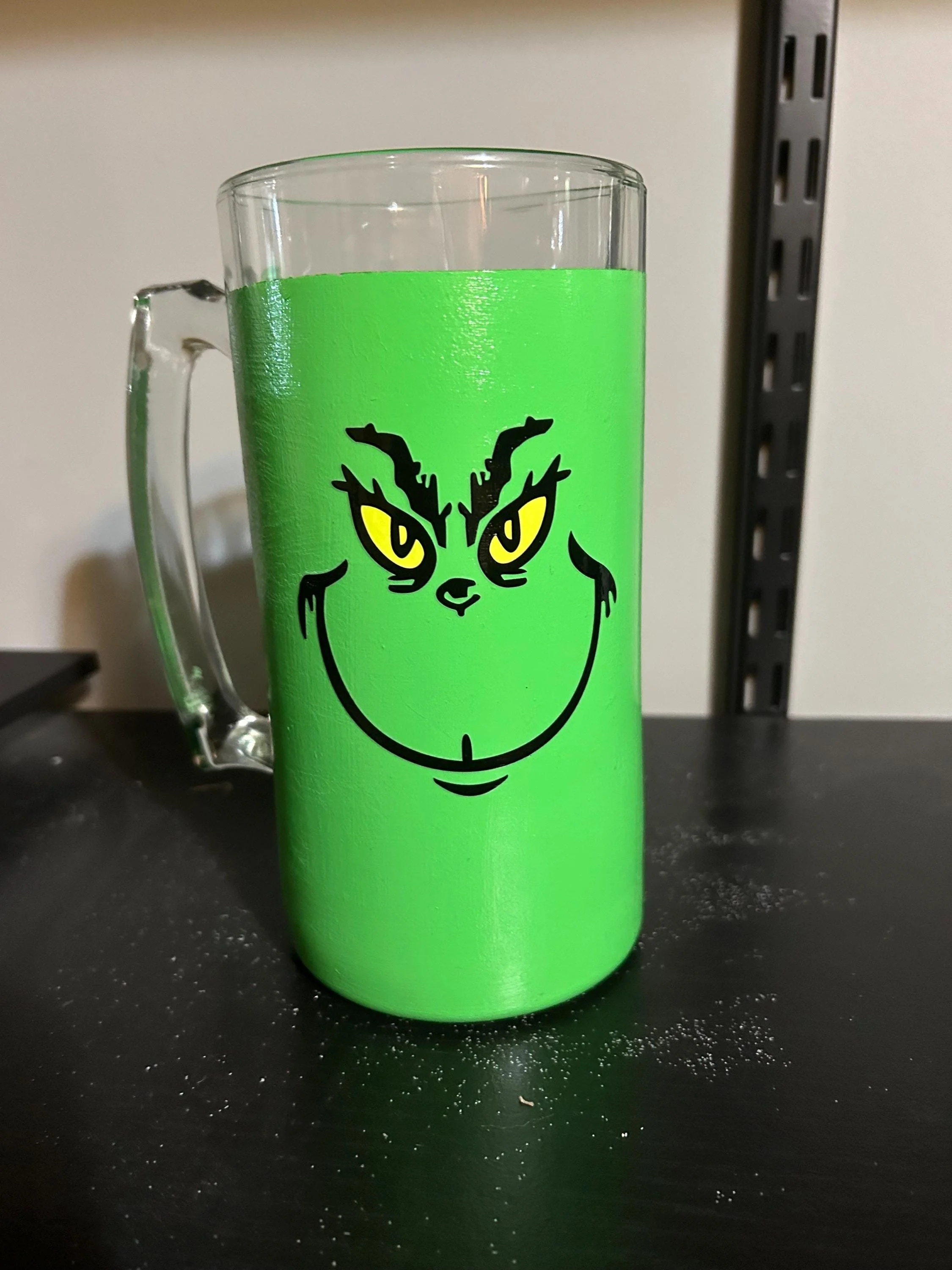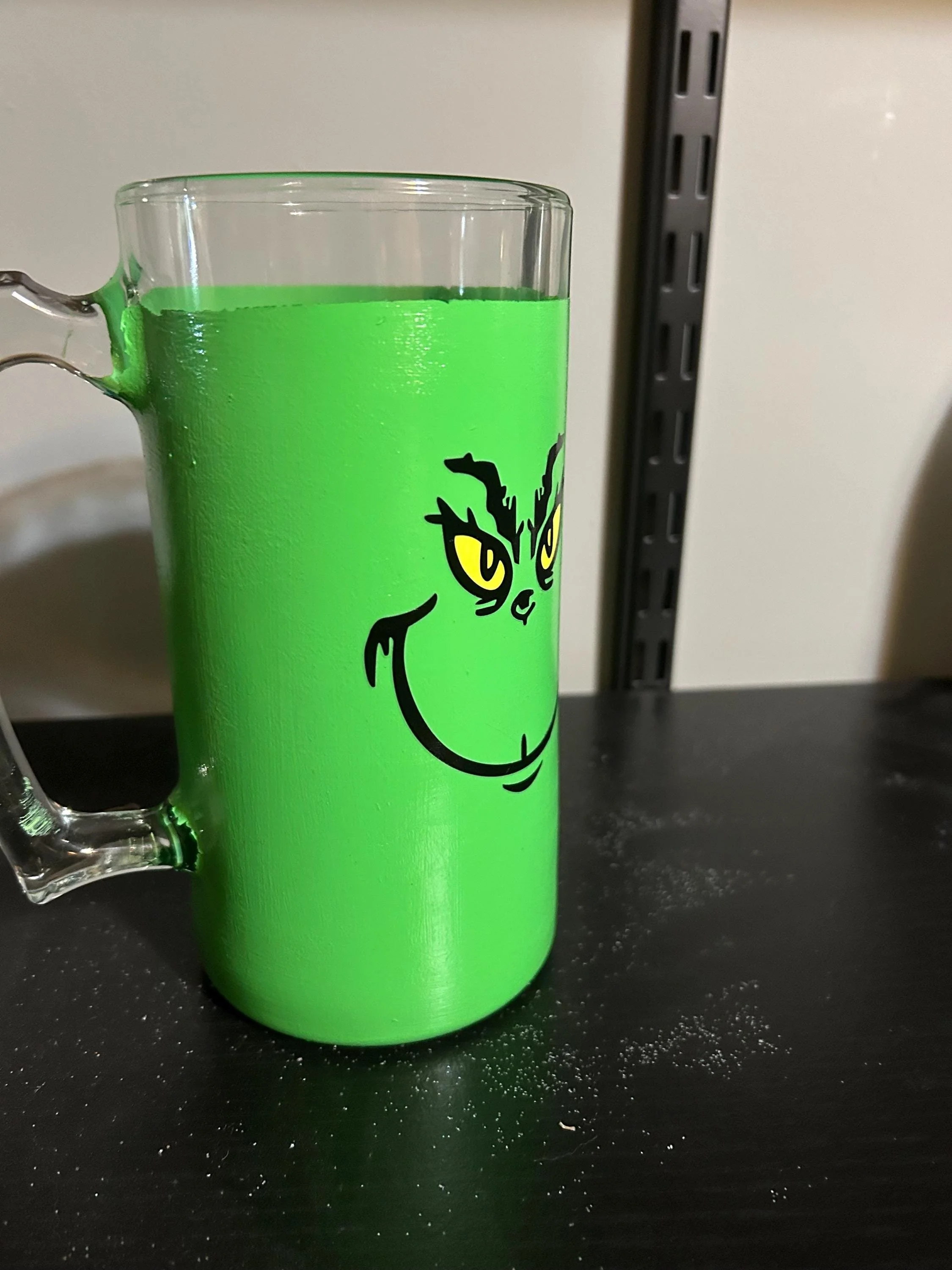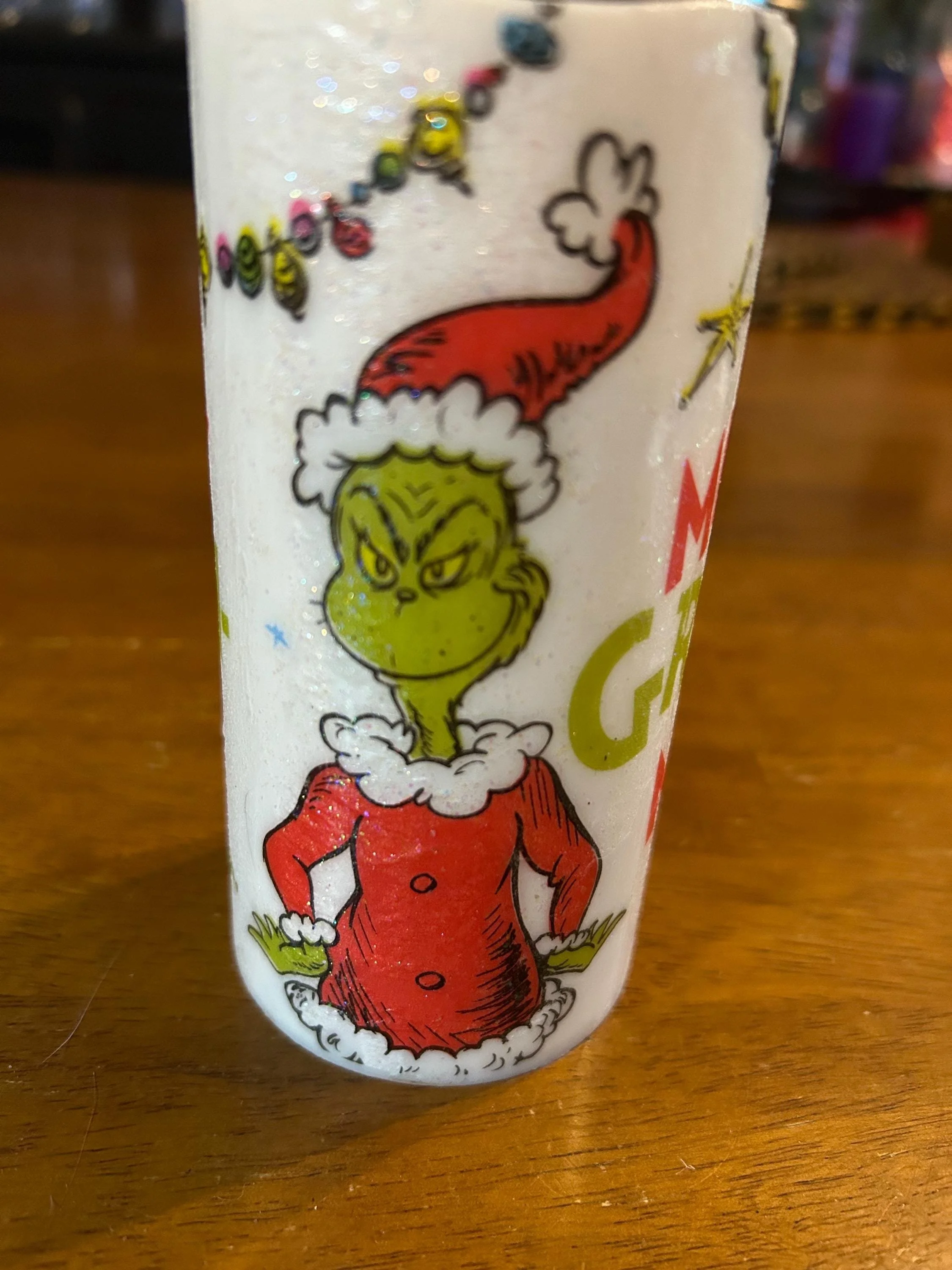 • Design: Grinch in Santa suit with “MERRY GRINCHMAS” text and festive accents