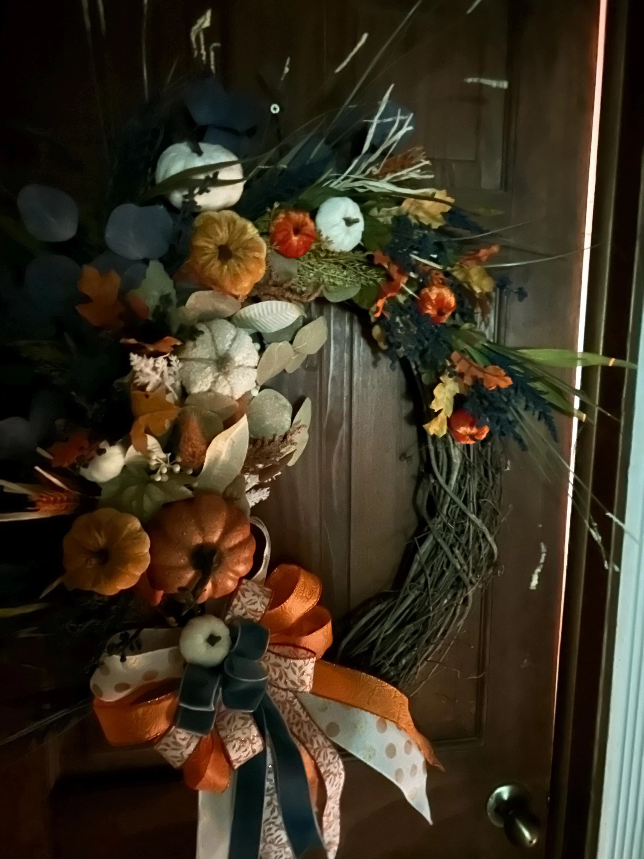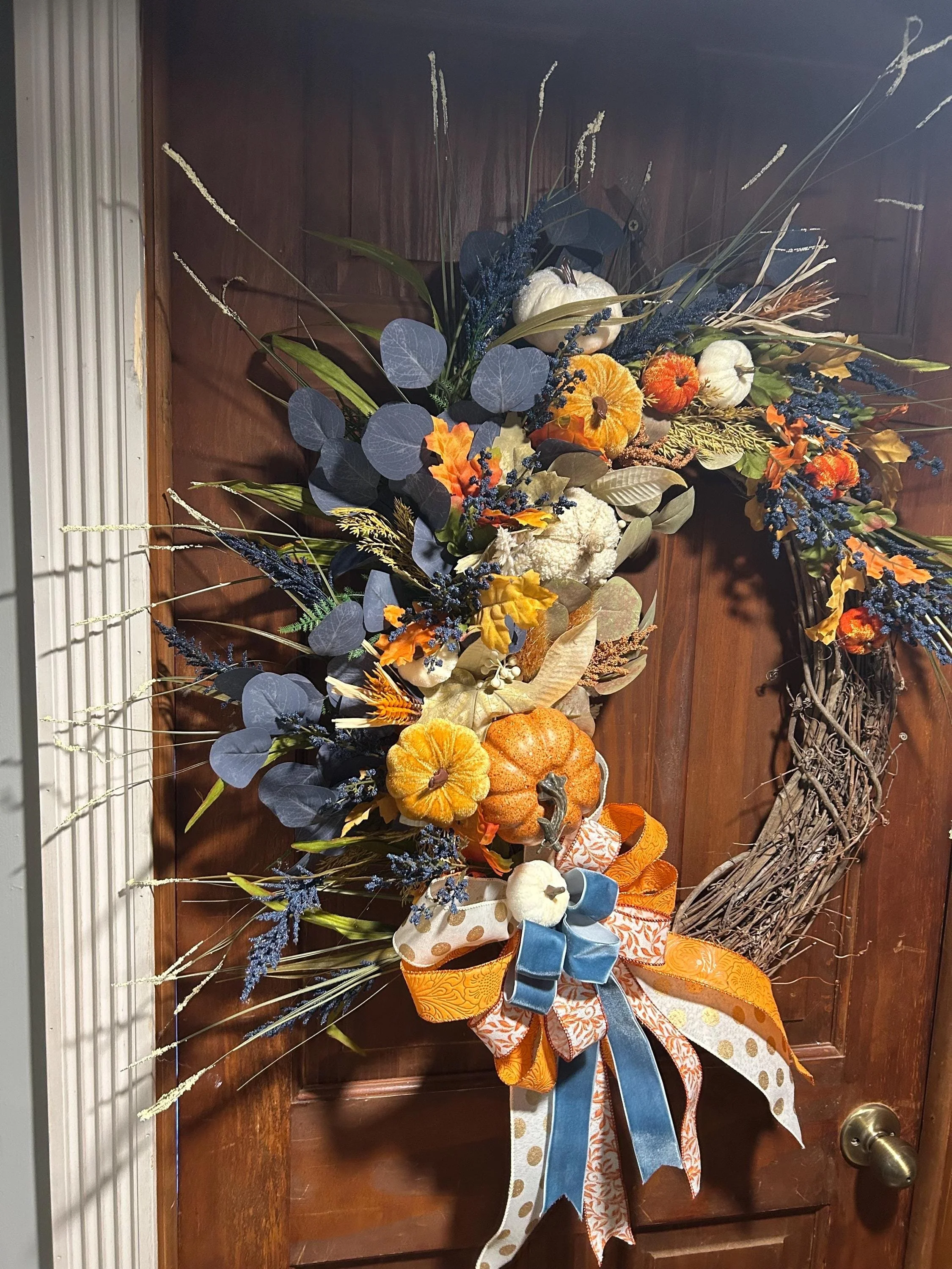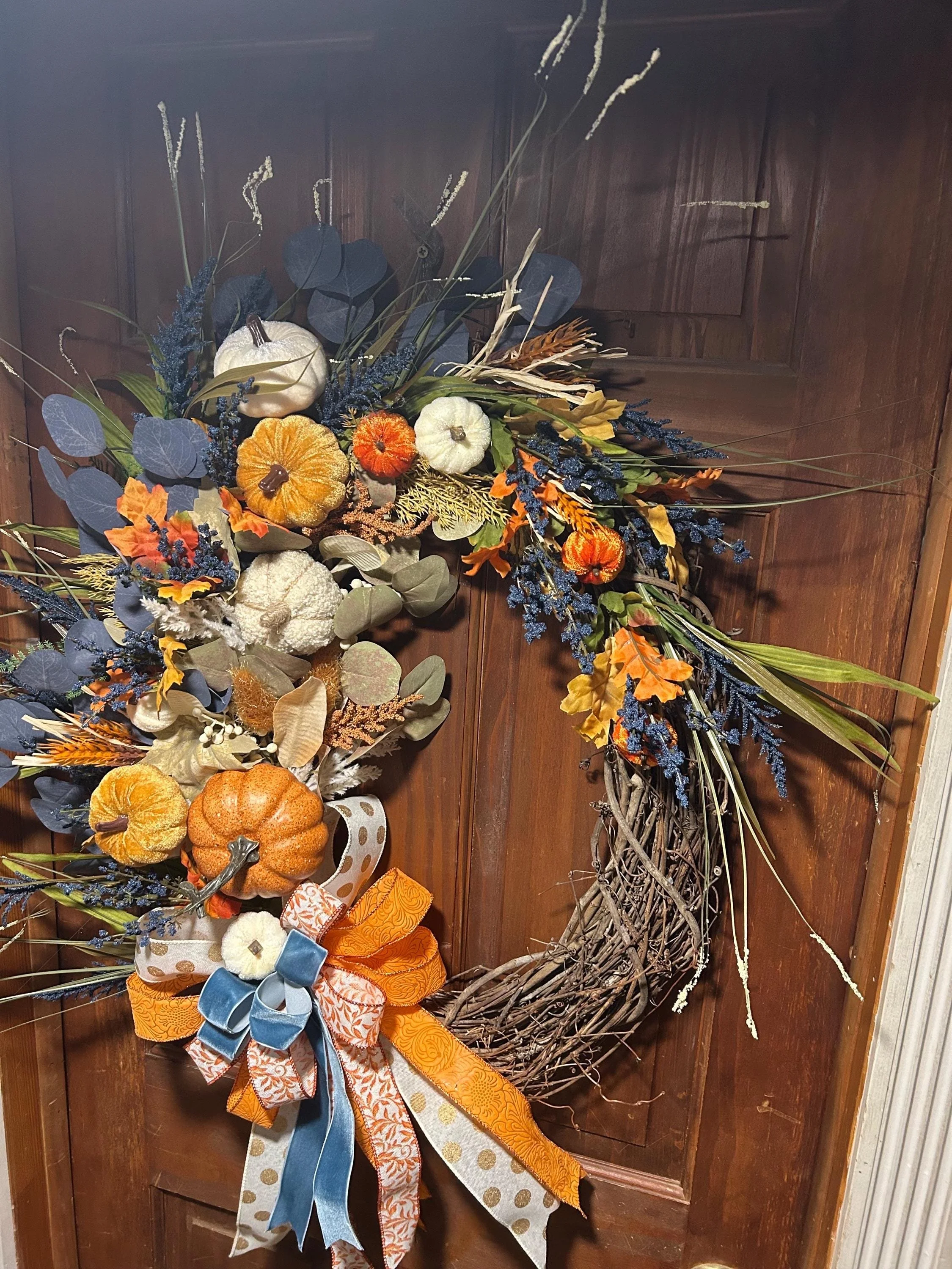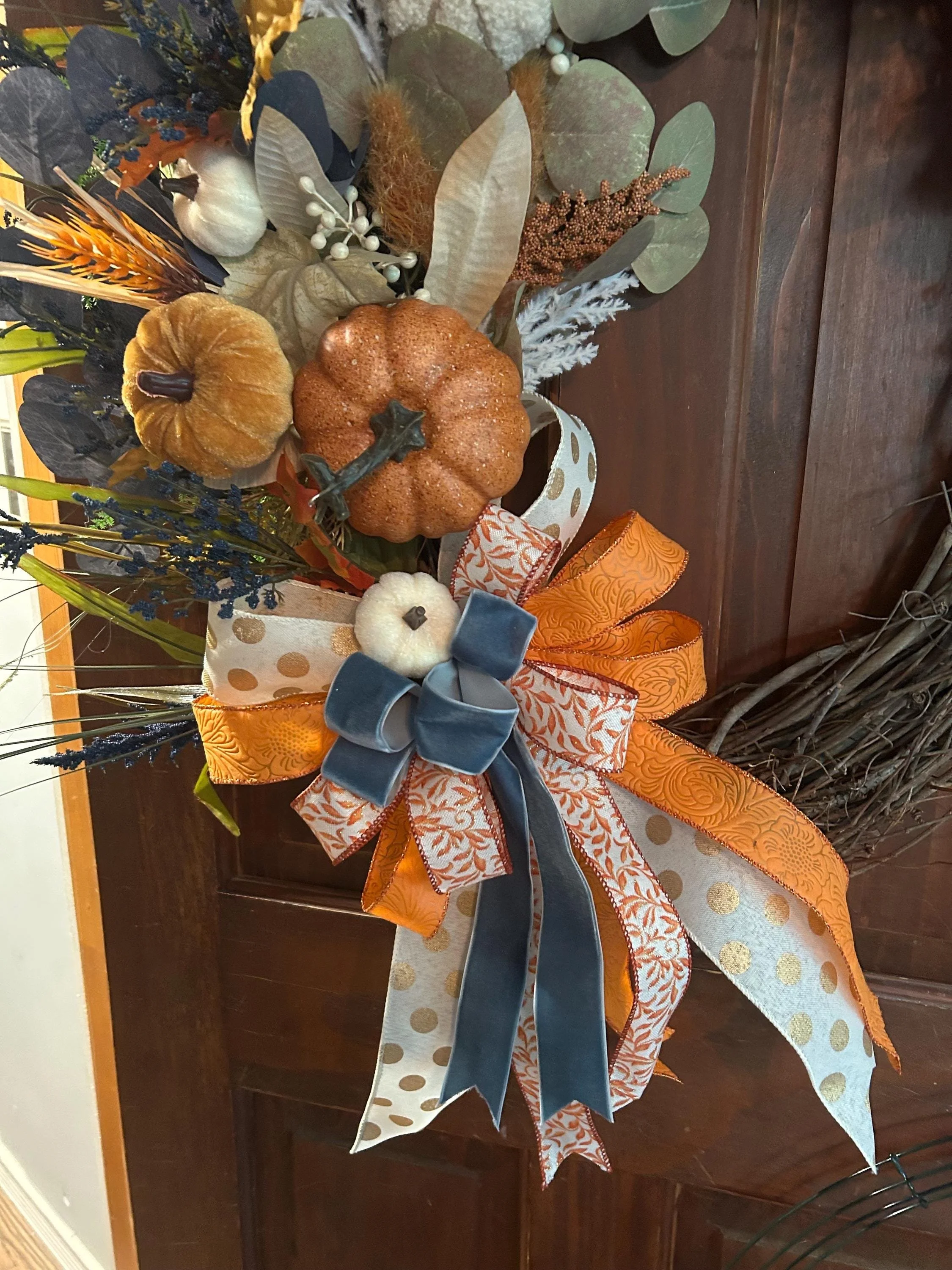 ✨ Description for Selling: Celebrate the magic of fall with the Whimsy Harvest Halo, a stunning 27x27” handcrafted autumn wreath that brings seasonal charm to any space. This one-of-a-kind piece features a lush arrangement of miniature pumpkins, vibrant florals, rustic leaves, and playful ribbons in a palette of warm oranges, creamy whites, soft blues, and earthy greens. Built on a sturdy twig base, its whimsical yet elegant design evokes the cozy spirit of harvest time and crisp autumn days.